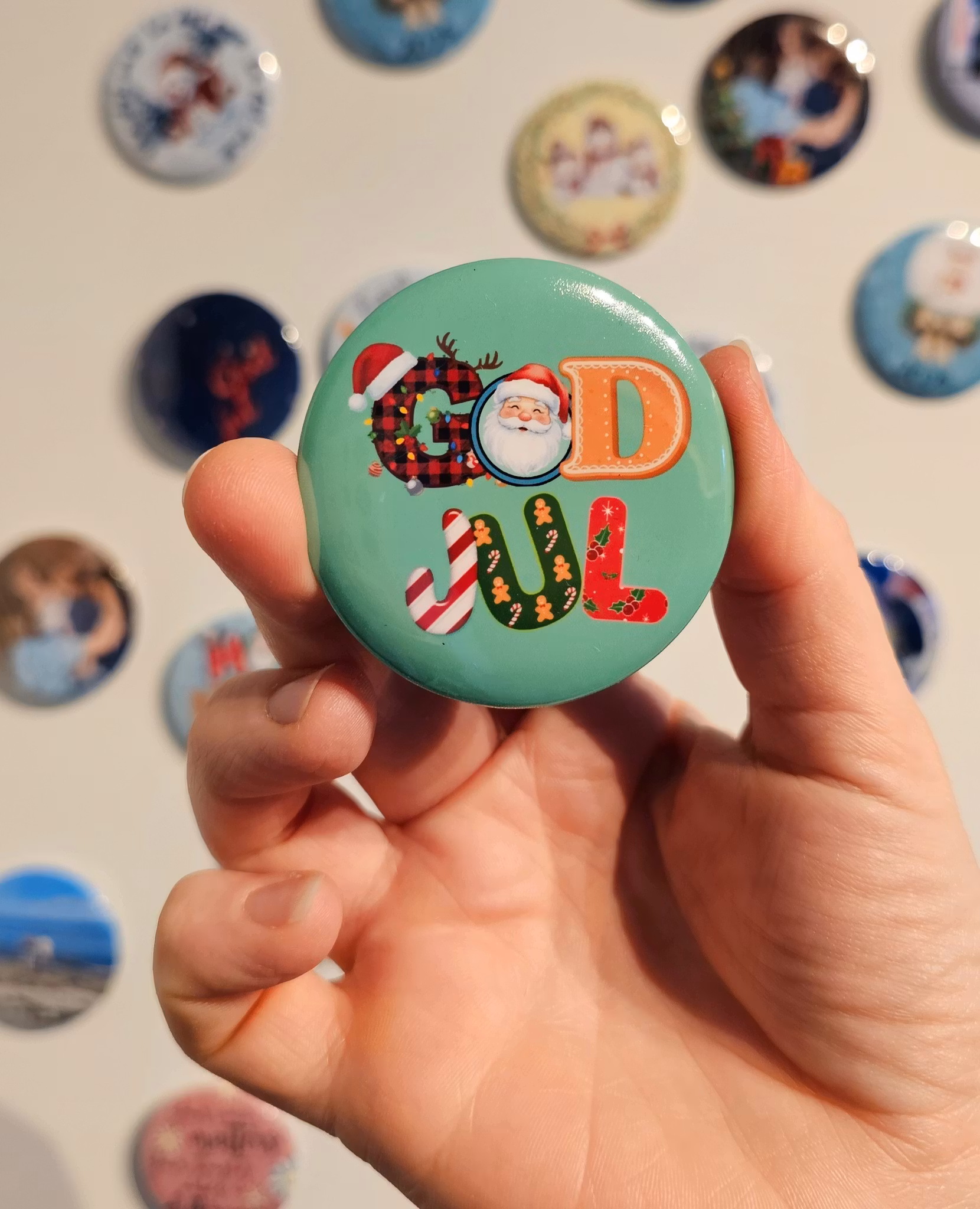 Spre julestemning med våre runde buttons med koselige julemotiv! Festes enkelt til klær, vesker, sekker, eller det du måtte ønske, med nålen på baksiden. Perfekt som små gaver under juletreet eller i julekalenderen.© 2025 HappyButtons
