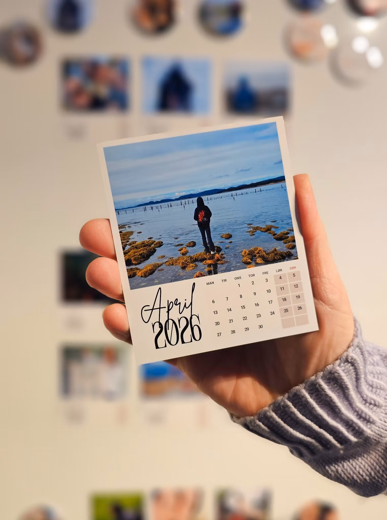 Last opp dine 12 favorittbilder (ett for hver måned), og du mottar dine helt egne kalendermagneter om kort tid.